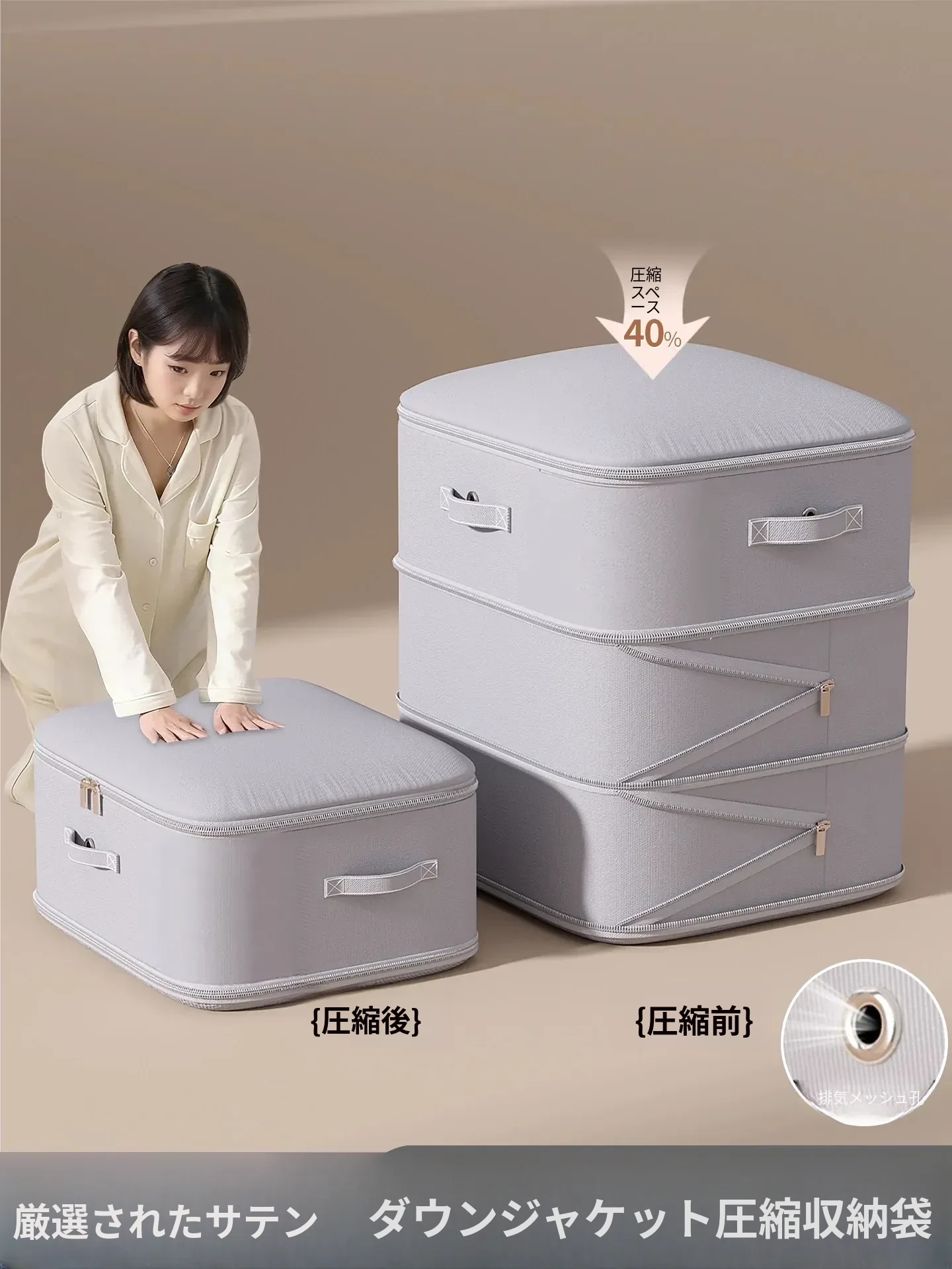 日本製ダウンジャケット専用圧縮袋!大容量収納で衣類や布団をすっきり整理。衣装ケースやクローゼットに最適なファブリック製収納バッグ。あなたの生活空間をスッキリ整えよう!