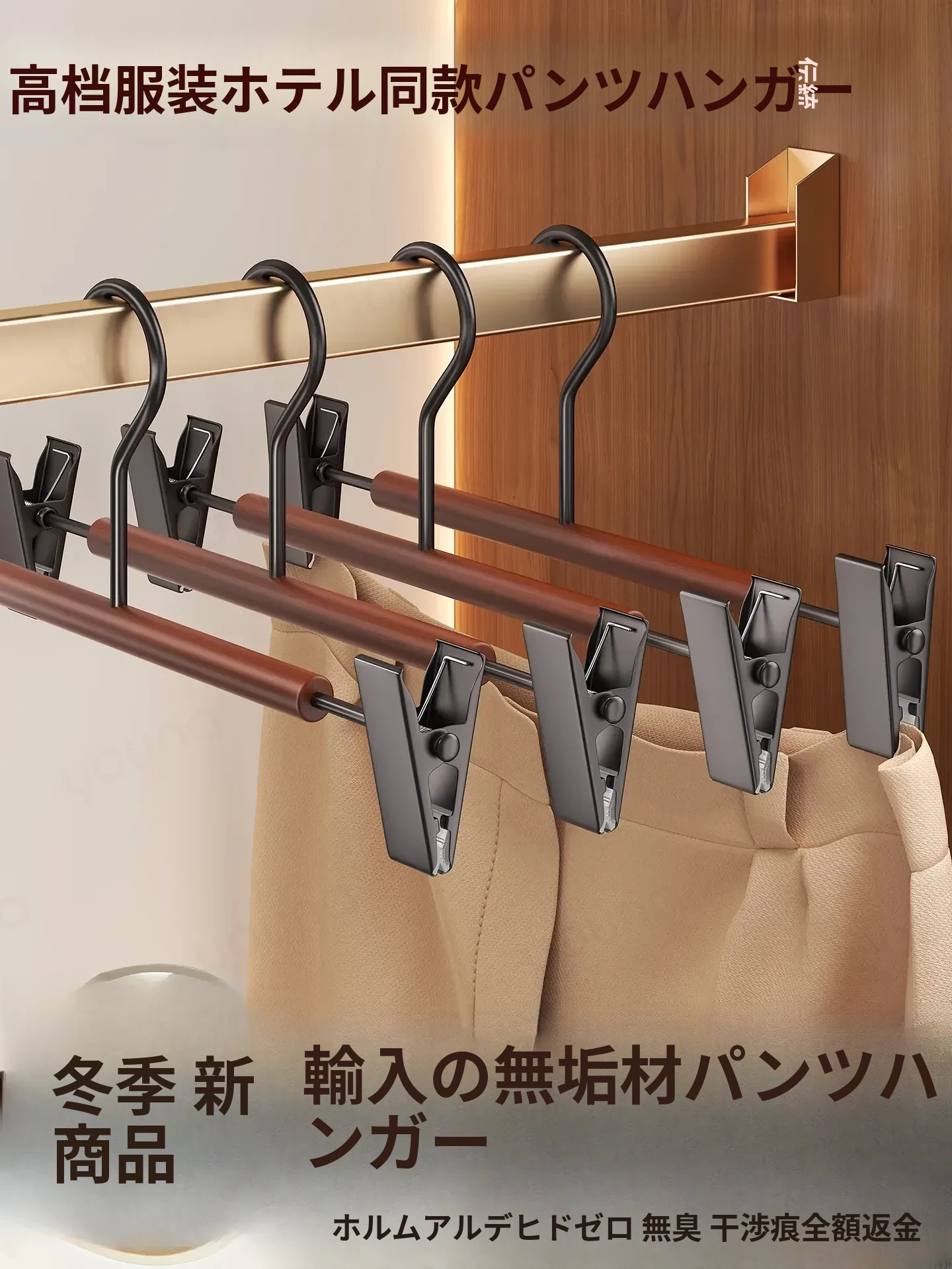 2026年新作!無痕防滑パンツハンガー - 家庭用&衣料品店専用!美しいブナ材とアイアン製のデザインで、ズボンやスカートをしっかりと保持。おしゃれで機能的な収納で、あなたの衣類を優雅に演出!